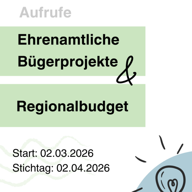 Ehrenamtliche Bürgerprojekte & Regionalbudget 2026 Am 02. März 2026 startet der neue Förderaufruf für die Ehrenamtlichen Bürgerprojekte sowie der Förderaufruf für das Re